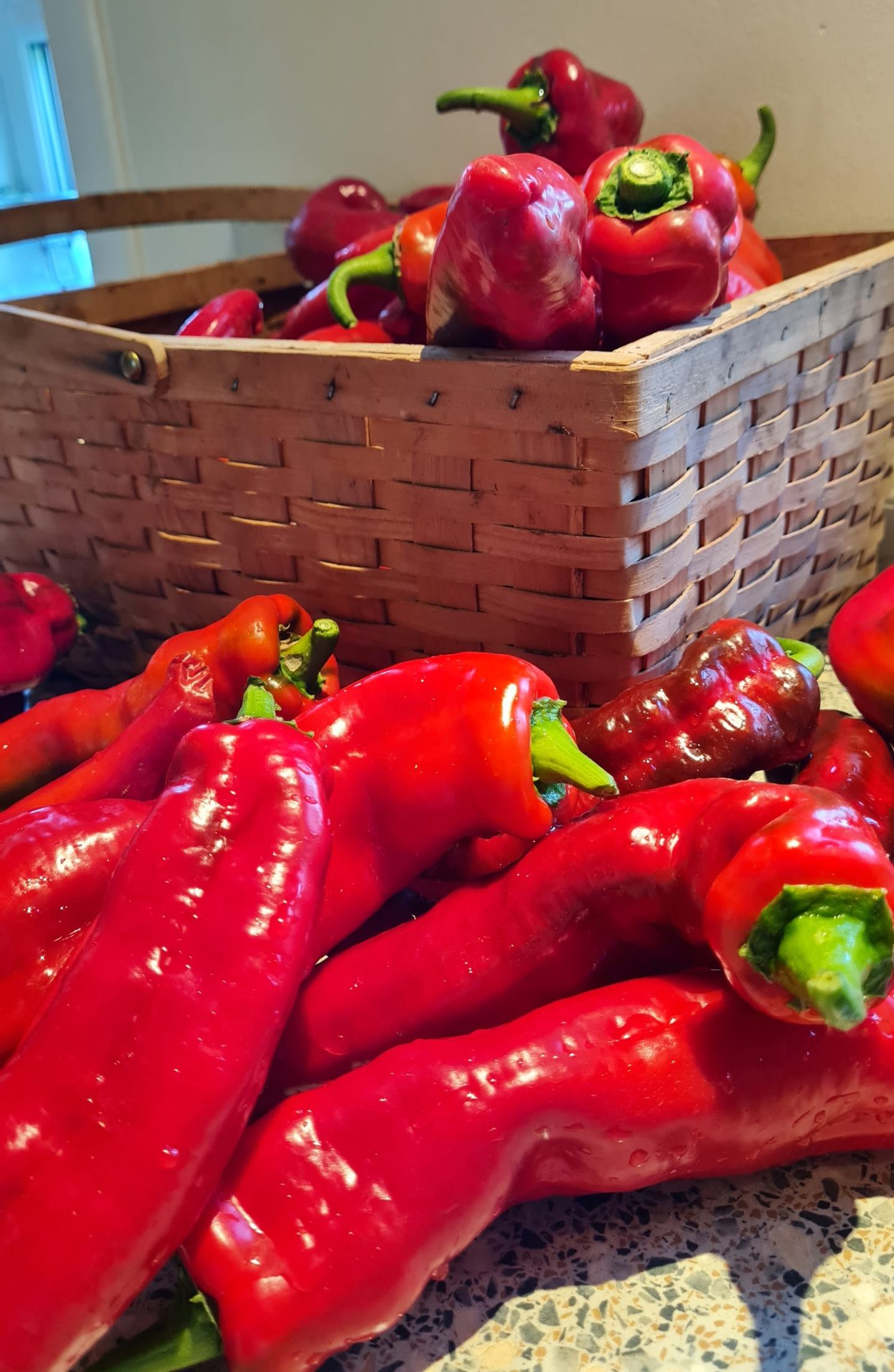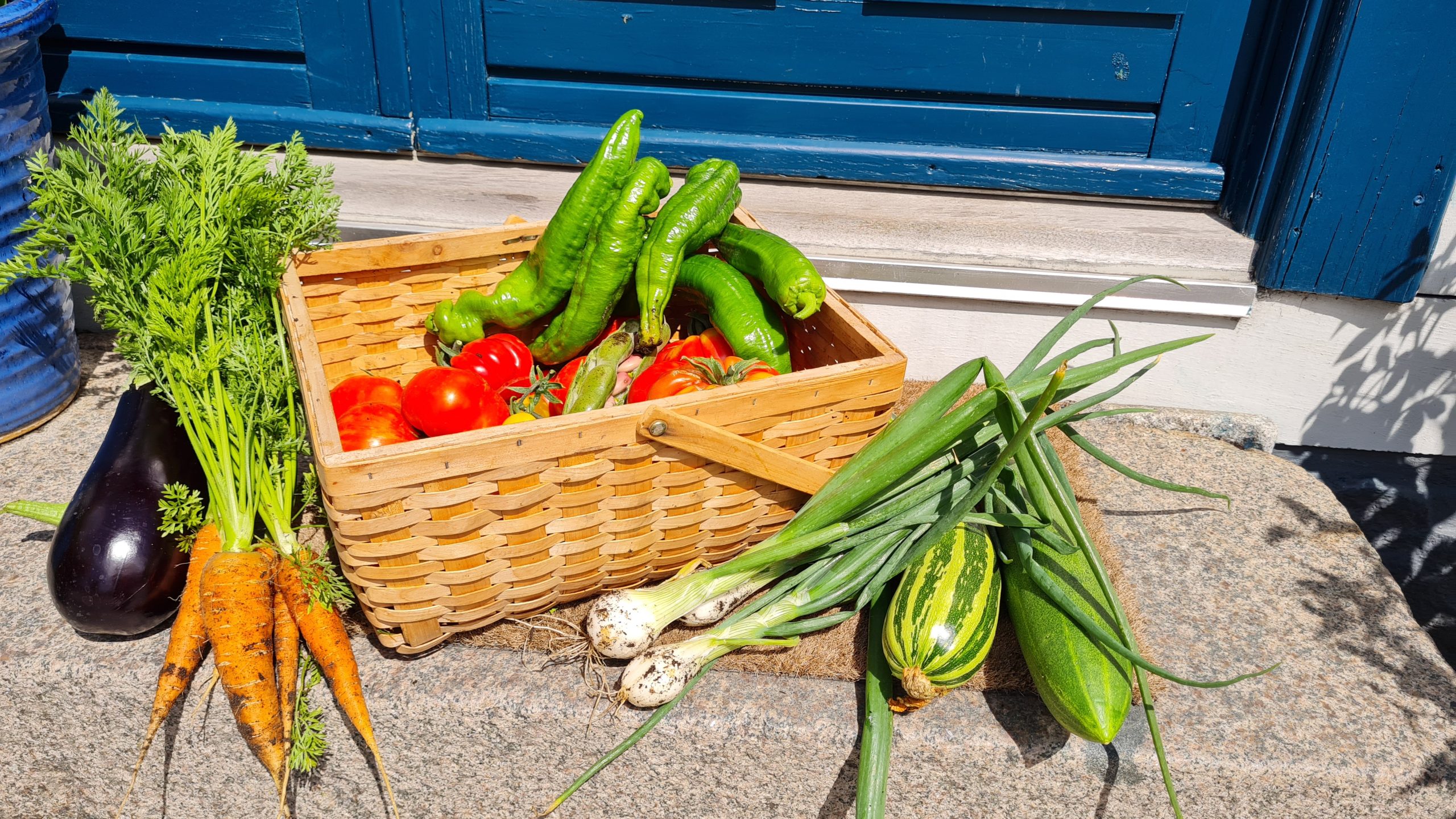 Til vores egen selvforsyning og de glas vi også sælger ud af, producerer vi: store mængder af tomater, agurker, løg, rødbeder, kål og alt det andet som som vi spiser løs af. Dertil squash, auberginer, broccoli, chili, snackpebre, majs, krydderurter og rabarber.