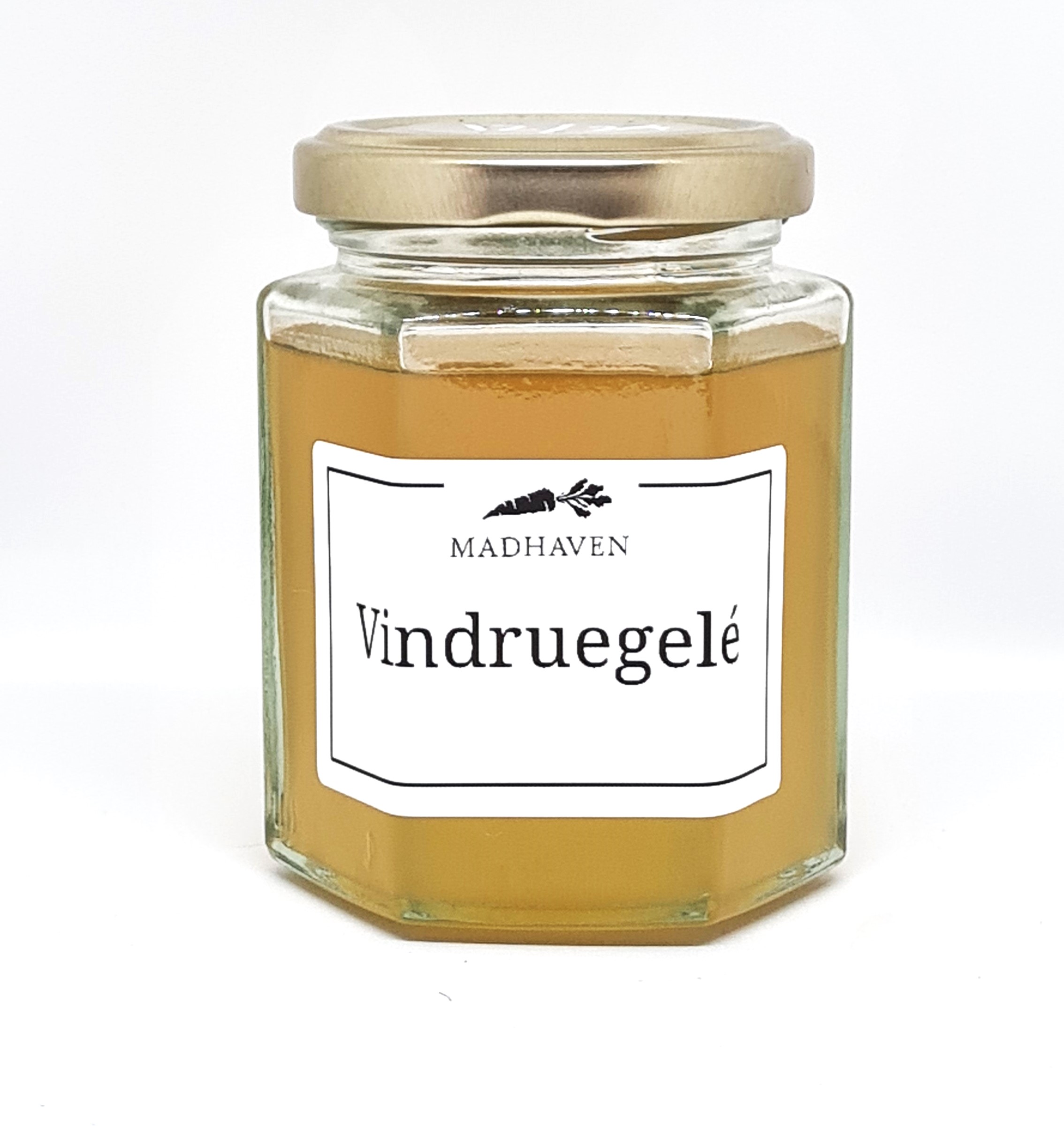 Lækker håndlavet vindruegelé, lavet på grønne vindruer fra vores drivehuse. Håndplukket, sorteret, renset og syltet til en skøn gul vindruegelé til vinterens simreretter.